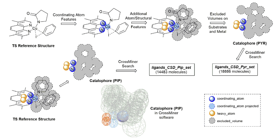 The ligands identification from the CSD was performed with the CSD-CrossMiner tool. A 3D structural query called catalophore was carried out using feature points to describe the transition state of the ligand (Figure 2). This search was performed using some new features of CrossMiner written by the authors of the work, specifically targeted to organometallic structures. Further polishing and filter application, such as the removal of polymers and structures with disorder, was applied to the structures obtained, leading to > 32000 potential ligands.