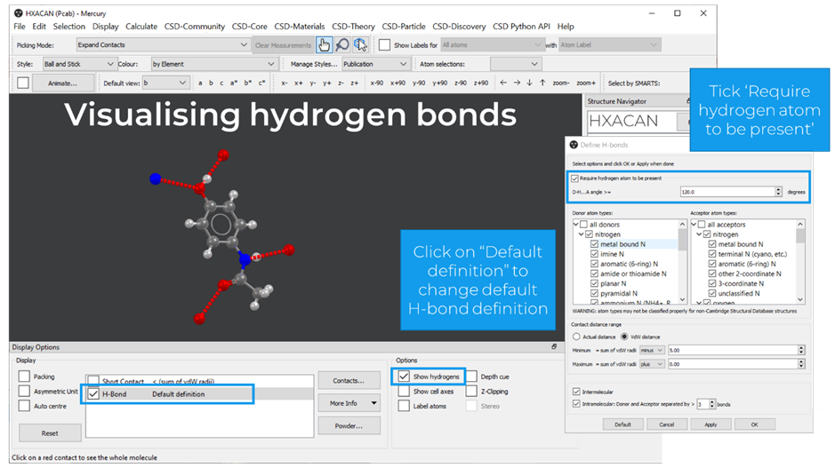 To view hydrogen bonds in a structure in Mercury, the user should tick “H-Bond” and “Show Hydrogens” in the Display section, Figure 1. The default H-bond definition can be changed, and the hydrogen bonds can be coloured by distance (Display > Colours > Contacts > Colour by distance).