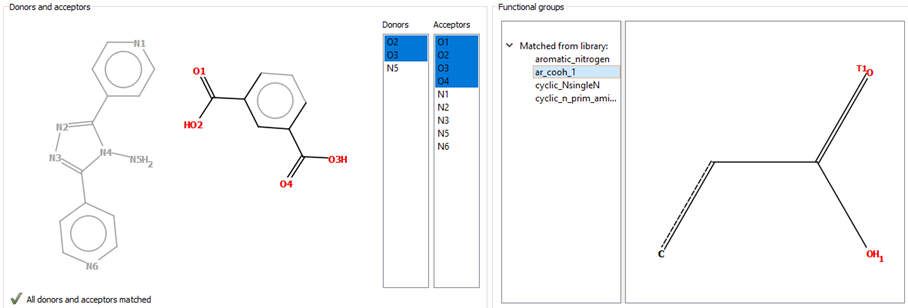 To use the HBP component, the user should open the structure in Mercury and go to the Propensity Prediction wizard. This is accessible through the path CSD-Materials > Polymorph Assessment > Hydrogen Bond Propensities. A 2D diagram of the molecule that was selected in Mercury will then appear, alongside a list of hydrogen-bond donors and acceptors included in that molecule, and a list of functional groups from the library available in Mercury for HBP (Figure 2). The component matches each of the donors and acceptors to the functional groups present in the library (Figure 2).