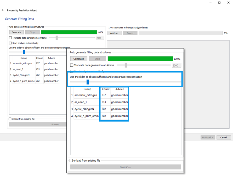 The next step consists of analysing the data extracted from the CSD, and this can be done by clicking “Analyse” from the “Generate Fitting Data” window. If any group has very low numbers highlighted in red on either True or False, the user should make sure the “Ignore?” checkbox is ticked.