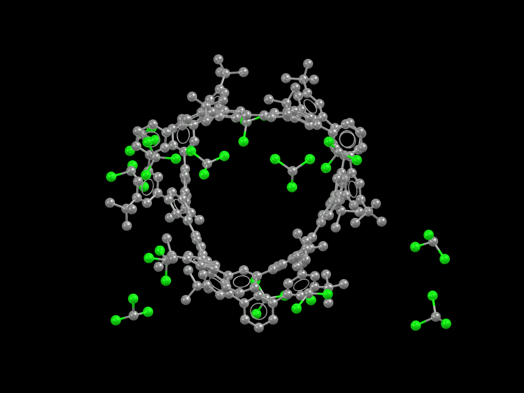The crystal structures, CSD Entries BICXEU and BICXIY, are nanometer sized hyperboloidal structures formed from oligomerization and they feature nanometer sized pores. These structures are published by Koki Ikemoto, Daiya Nagata, Taisuke Matsuno and Hiroyuki Isobe in Chemistry-An Asian Journal, DOI: 10.1002/asia.202300046.