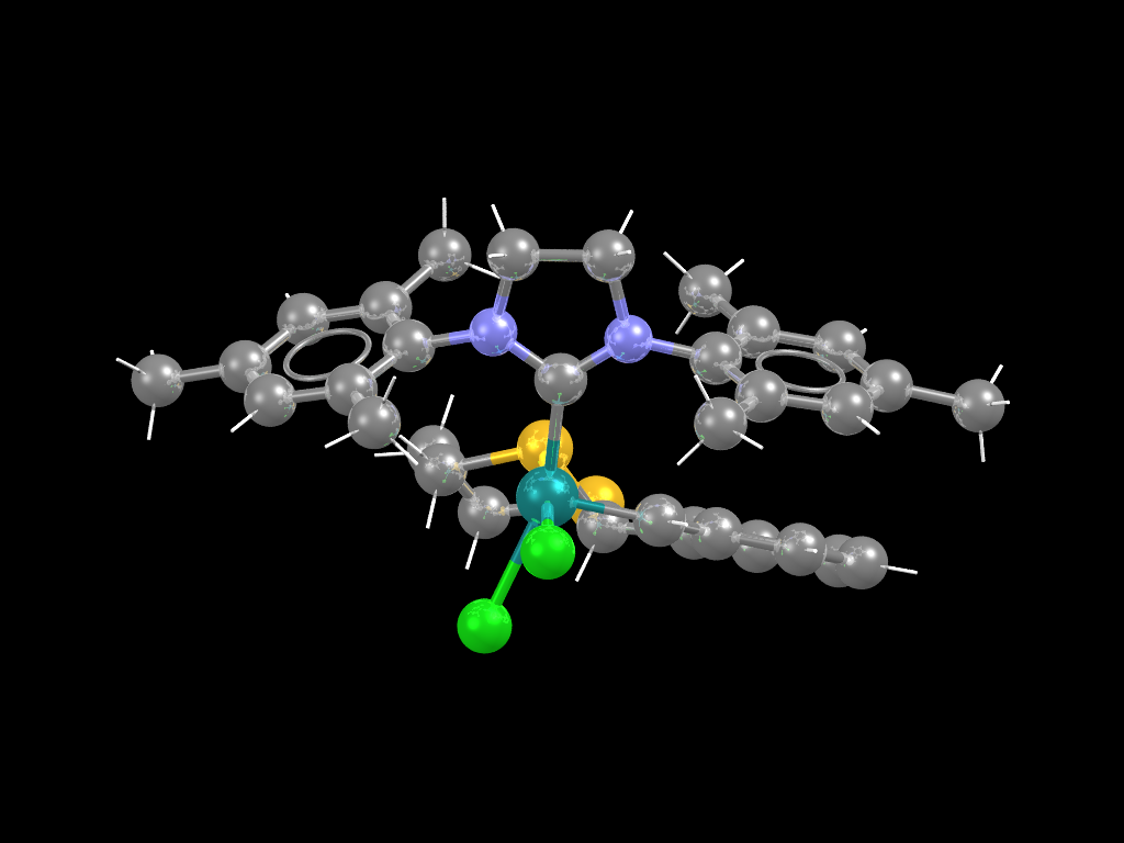 The structure shown below is a metal-organic complex with a ruthenium metal centre and an N-heterocyclic carbene (NHC) ligand.