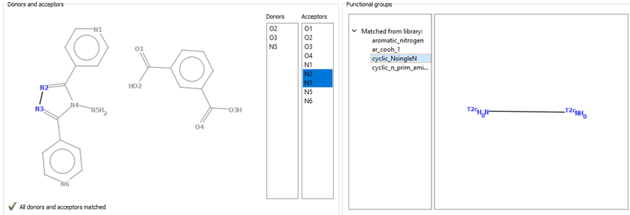 To use the HBP component, the user should open the structure in Mercury and go to the Propensity Prediction wizard. This is accessible through the path CSD-Materials > Polymorph Assessment > Hydrogen Bond Propensities. A 2D diagram of the molecule that was selected in Mercury will then appear, alongside a list of hydrogen-bond donors and acceptors included in that molecule, and a list of functional groups from the library available in Mercury for HBP (Figure 2). The component matches each of the donors and acceptors to the functional groups present in the library (Figure 2).