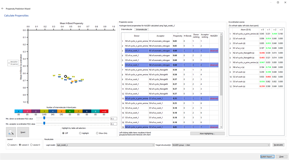 The coordination scores in the chart are colour coded to indicate how the donor and acceptor atoms’ behaviour in the active network compares to observations in the CSD. The green highlighted values indicate that the atom is following the expected trend, while the red values represent deviations from the expected behaviour. For example, row 10 in the list in Figure 4 identifies oxygen atom O2 of a carboxylic acid which strongly prefers to not participate in any hydrogen bond interactions, but that is involved in one bond in the active structure.