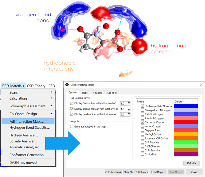 As can be seen in Figure 5, this component is accessible via Mercury, through the path CSD-Materials > Full Interaction Maps. Different probes can be used to study the most common intermolecular interactions (Figure 5): for example, probes for hydrogen-bond donors, acceptors and hydrophobic interactions are available.